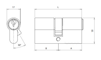 Cilindro com corpo em latão de 4 ou 5 pistões, excêntrico a 30°. Fornecido com 3 chaves em latão niquelado. Funcionamento: rodar chave 360°. As chaves são dependentes, e não se pode operar o cilindro se no outro lado a chave estiver inserida e rodada.