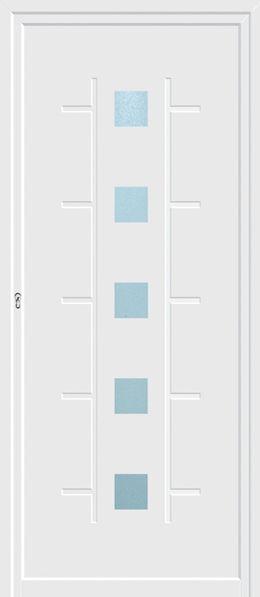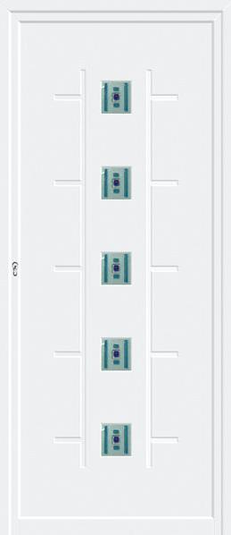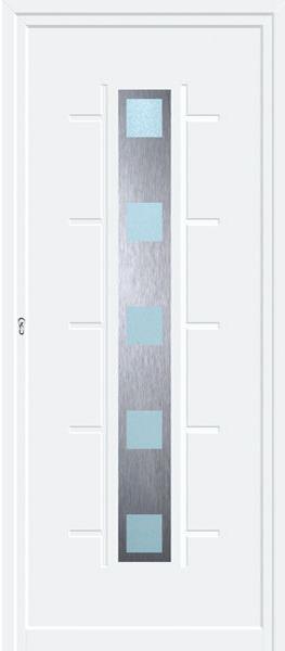 Painel de porta composto por 2 chapas de alumínio termolacado e poliuretano injetado, formando uma estrutura estratificada (sanduíche) com espessura standard de 24mm.