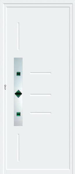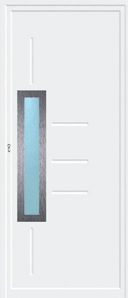 Painel de porta composto por 2 chapas de alumínio termolacado e poliuretano injetado, formando uma estrutura estratificada (sanduíche) com espessura standard de 24mm.