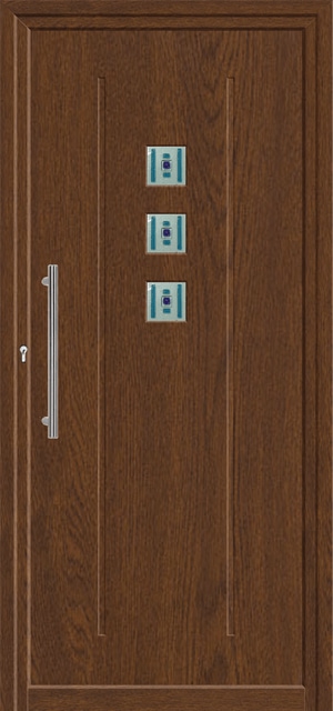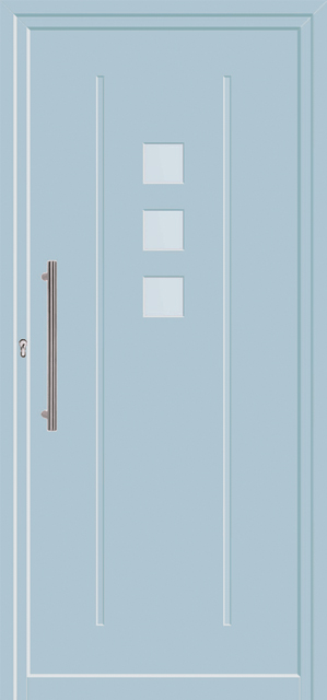 Painel de porta composto por 2 chapas de alumínio termolacado e poliuretano injetado, formando uma estrutura estratificada (sanduíche) com espessura standard de 24mm.