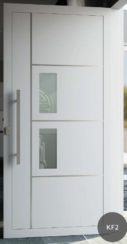 Painel de porta composto por 2 chapas de alumínio de 2,5mm de espessura com poliuretano injetado entre ambas, à densidade de 120kg/m3, com ou sem vidro.