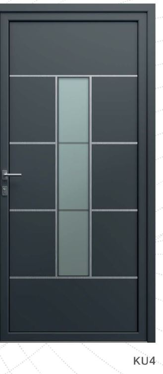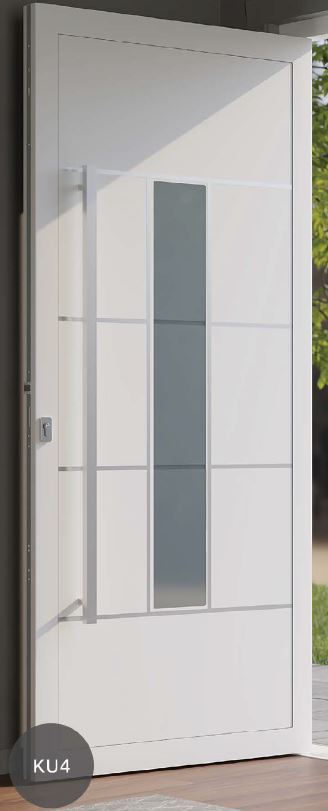 Painel de porta composto por 2 chapas de alumínio de 2,5mm de espessura com poliuretano injetado entre ambas, à densidade de 120kg/m3, com ou sem vidro.