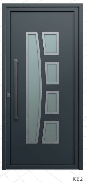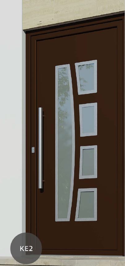 Painel de porta composto por 2 chapas de alumínio de 2,5mm de espessura com poliuretano injetado entre ambas, à densidade de 120kg/m3, com ou sem vidro.