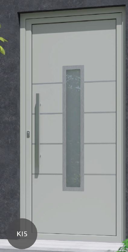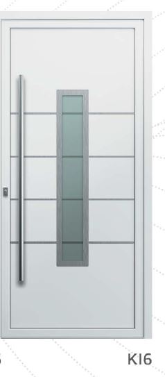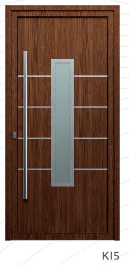 Painel de porta composto por 2 chapas de alumínio de 2,5mm de espessura com poliuretano injetado entre ambas, à densidade de 120kg/m3, com ou sem vidro.