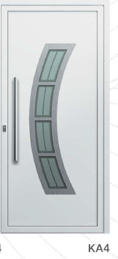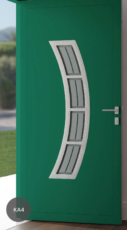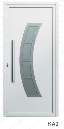 Painel de porta composto por 2 chapas de alumínio de 2,5mm de espessura com poliuretano injetado entre ambas, à densidade de 120kg/m3, com ou sem vidro.