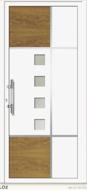 Painel de porta composto por 2 chapas de alumínio de 2,5mm de espessura com poliuretano injetado entre ambas, à densidade de 120kg/m3, com ou sem vidro.