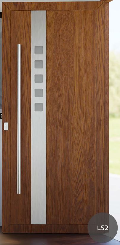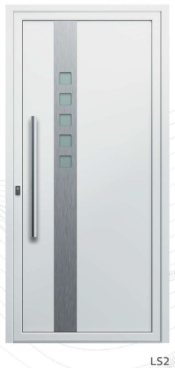 Painel de porta composto por 2 chapas de alumínio de 2,5mm de espessura com poliuretano injetado entre ambas, à densidade de 120kg/m3, com ou sem vidro.