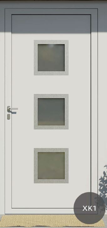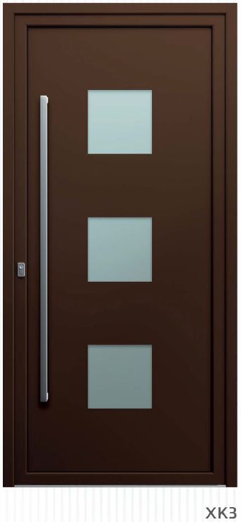 Painel de porta composto por 2 chapas de alumínio de 2,5mm de espessura com poliuretano injetado entre ambas, à densidade de 120kg/m3, com ou sem vidro.