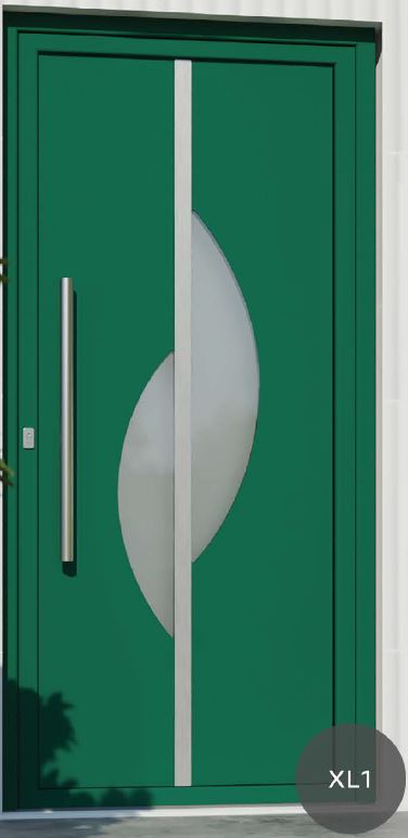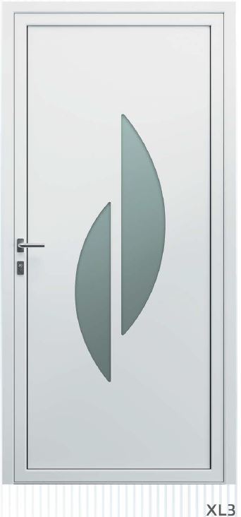 Painel de porta composto por 2 chapas de alumínio de 2,5mm de espessura com poliuretano injetado entre ambas, à densidade de 120kg/m3, com ou sem vidro.