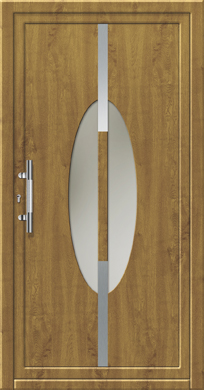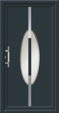 Painel de porta composto por 2 chapas de alumínio de 2,5mm de espessura com poliuretano injetado entre ambas, à densidade de 120kg/m3, com ou sem vidro.