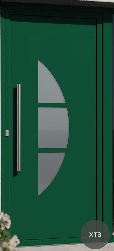 Painel de porta composto por 2 chapas de alumínio de 2,5mm de espessura com poliuretano injetado entre ambas, à densidade de 120kg/m3, com ou sem vidro.