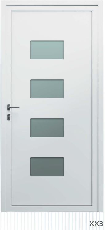 ​​​​​​Painel de porta composto por 2 chapas de alumínio de 2,5mm de espessura com poliuretano injetado entre ambas, à densidade de 120kg/m3, com ou sem vidro.