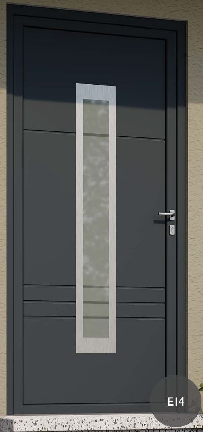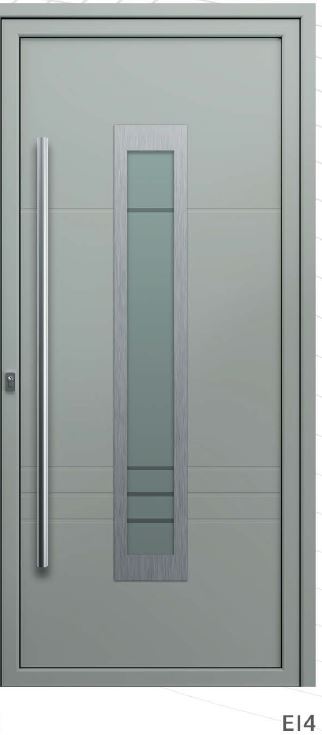Painel de porta composto por 2 chapas de alumínio de 2,5mm de espessura com poliuretano injetado entre ambas, à densidade de 120kg/m3, com ou sem vidro.