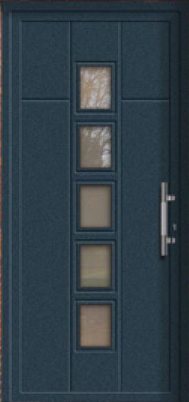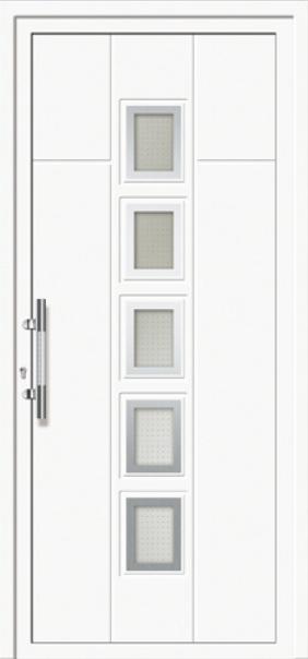 Painel de porta composto por 2 chapas de alumínio de 2,5mm de espessura com poliuretano injetado entre ambas, à densidade de 120kg/m3, com ou sem vidro.