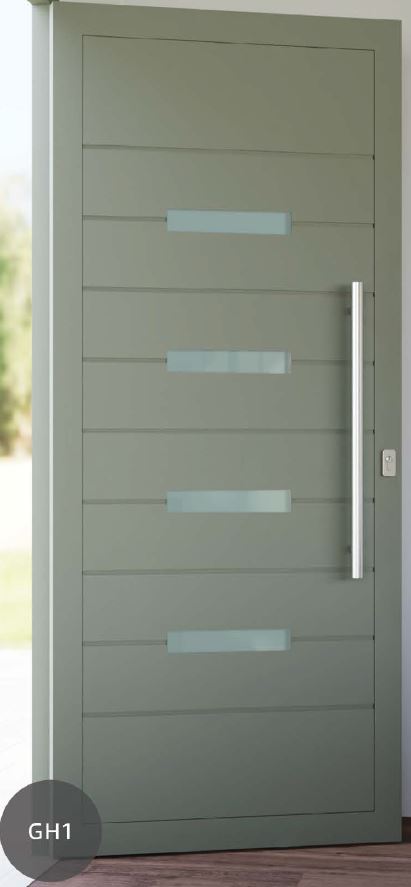 ​​​​​​Painel de porta composto por 2 chapas de alumínio de 2,5mm de espessura com poliuretano injetado entre ambas, à densidade de 120kg/m3, com ou sem vidro.