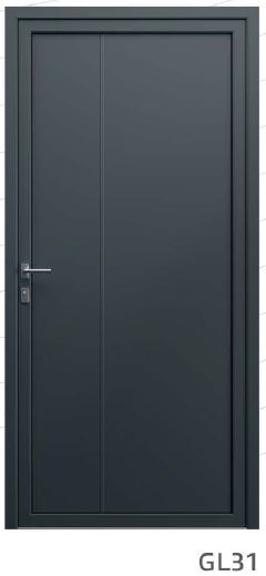 ​​​​​​Painel de porta composto por 2 chapas de alumínio de 2,5mm de espessura com poliuretano injetado entre ambas, à densidade de 120kg/m3, com ou sem vidro.