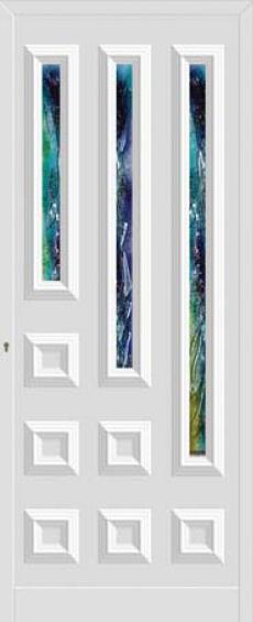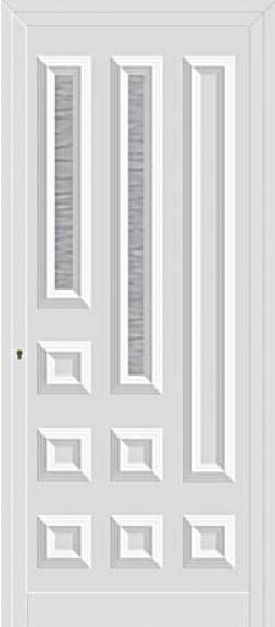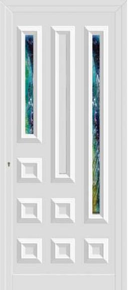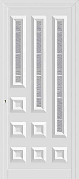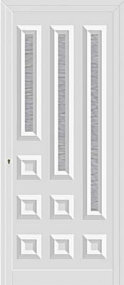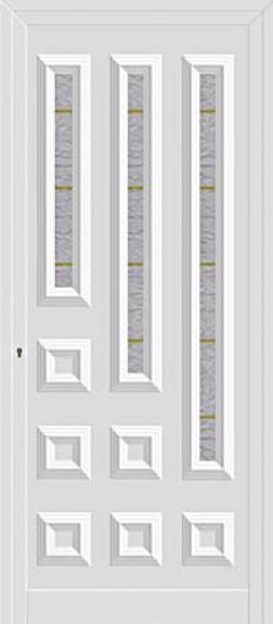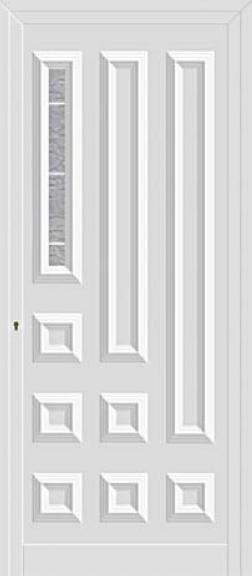 Painel de porta composto por 2 chapas de alumínio de 1,5/1,8mm de espessura, termolacado e poliuretano injetado, formando uma estrutura estratificada (sanduíche) com espessura standard de 20/24mm.