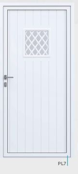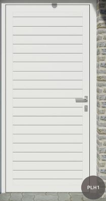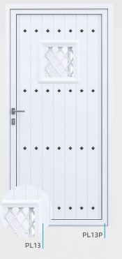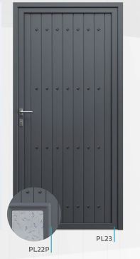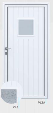Painel de porta composto por 2 chapas de alumínio de 1,8mm de espessura com poliuretano injetado entre ambas, à densidade de 120kg/m3, com ou sem vidro.
