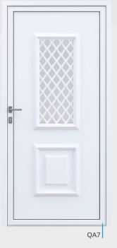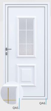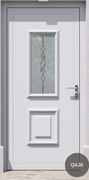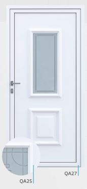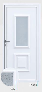 Painel de porta composto por 2 chapas de alumínio de 1,8mm de espessura com poliuretano injetado entre ambas, à densidade de 120kg/m3, com ou sem vidro.