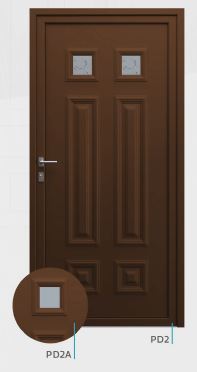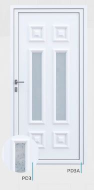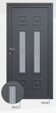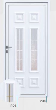 Painel de porta composto por 2 chapas de alumínio de 1,8mm de espessura com poliuretano injetado entre ambas, à densidade de 120kg/m3, com ou sem vidro.