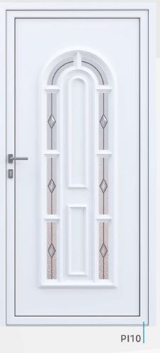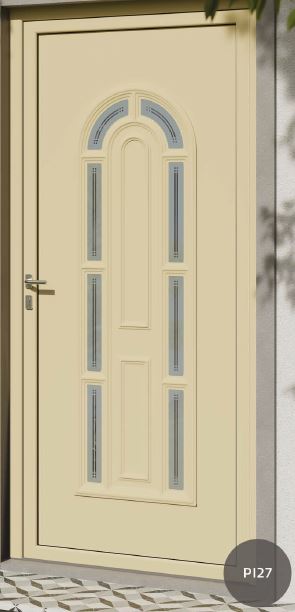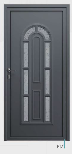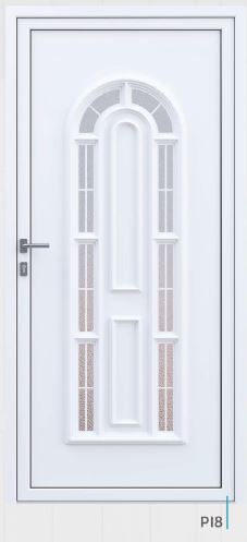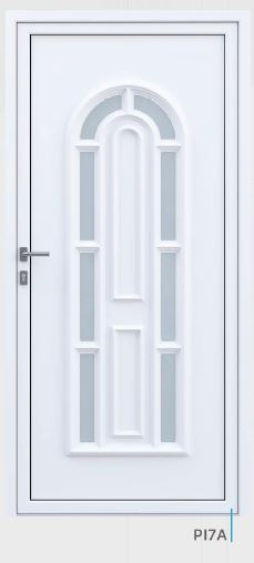 Painel de porta composto por 2 chapas de alumínio de 1,8mm de espessura com poliuretano injetado entre ambas, à densidade de 120kg/m3, com ou sem vidro.