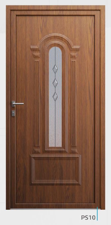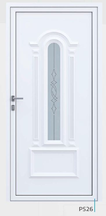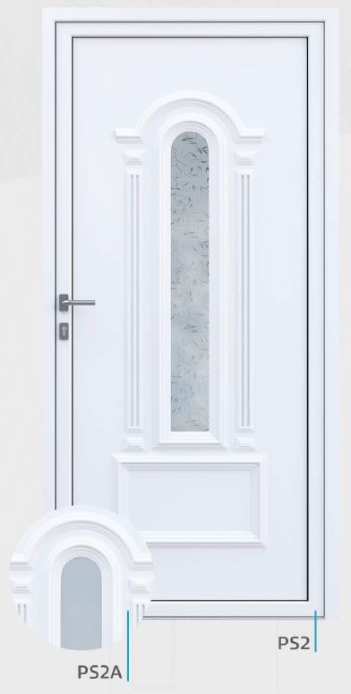 Painel de porta composto por 2 chapas de alumínio de 1,8mm de espessura com poliuretano injetado entre ambas, à densidade de 120kg/m3, com ou sem vidro.