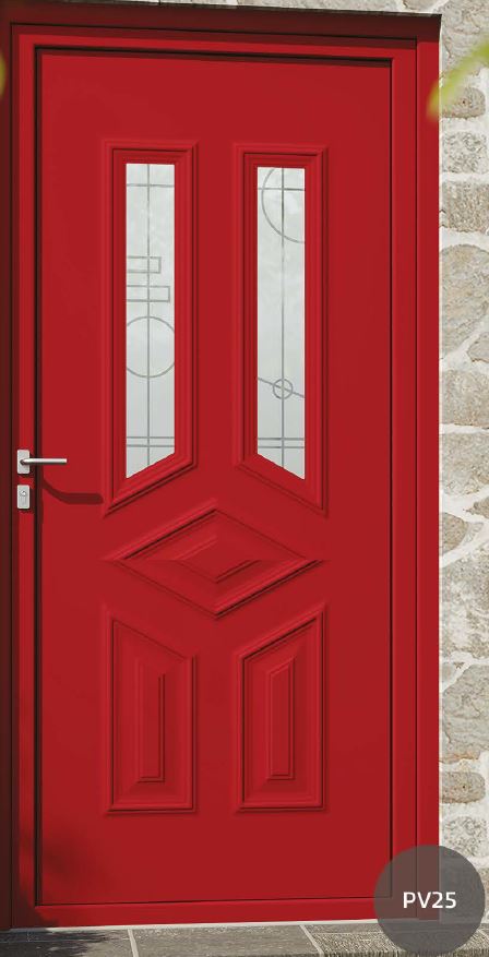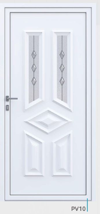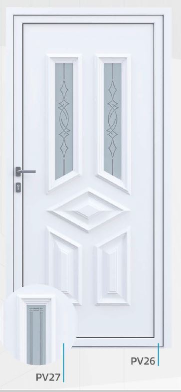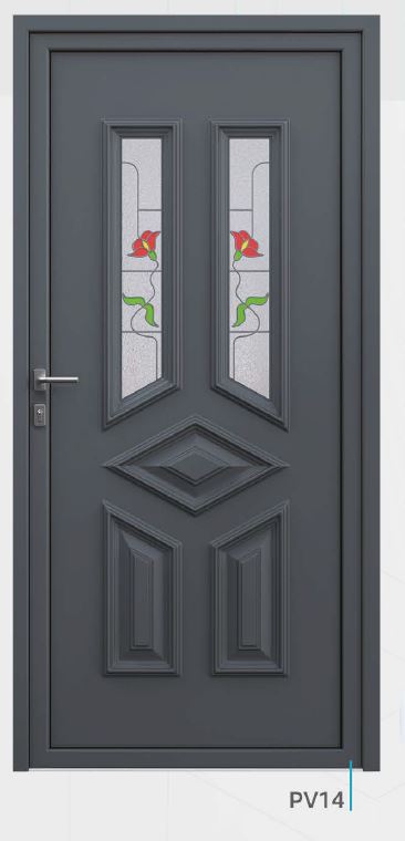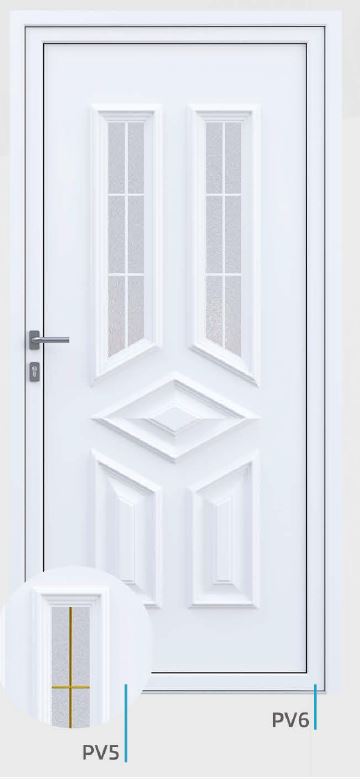 Painel de porta composto por 2 chapas de alumínio de 1,8mm de espessura com poliuretano injetado entre ambas, à densidade de 120kg/m3, com ou sem vidro.