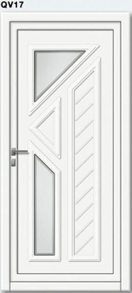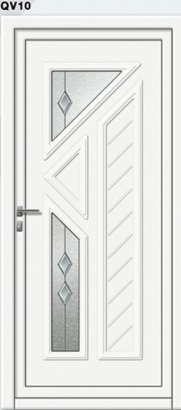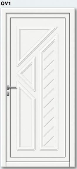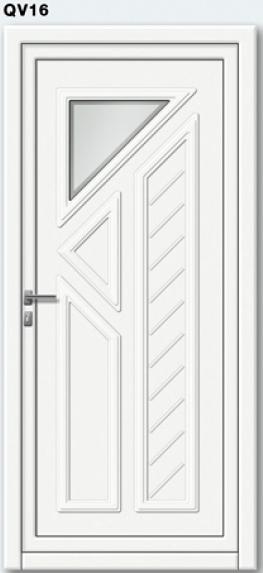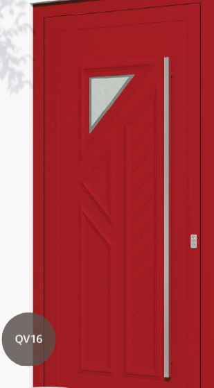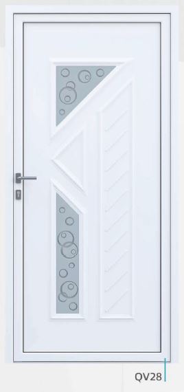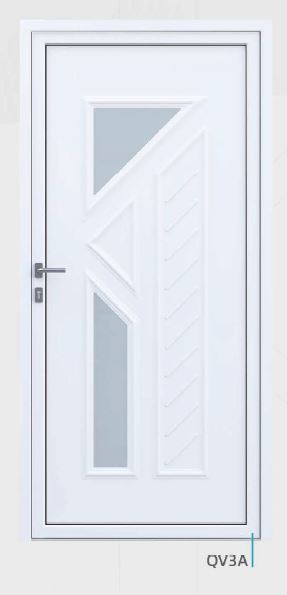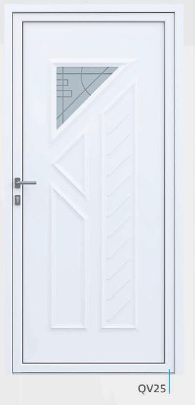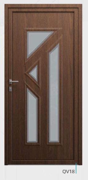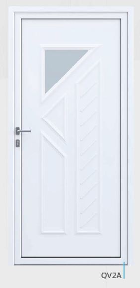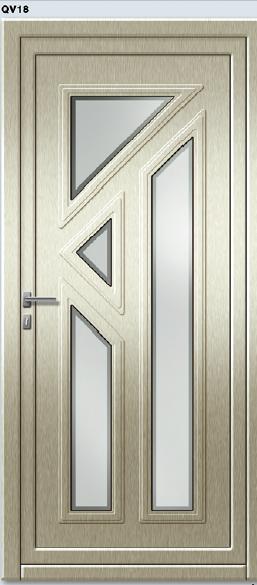 Painel de porta composto por 2 chapas de alumínio de 1,8mm de espessura com poliuretano injetado entre ambas, à densidade de 120kg/m3, com ou sem vidro.