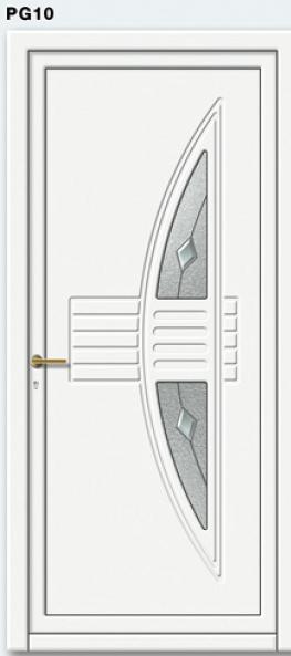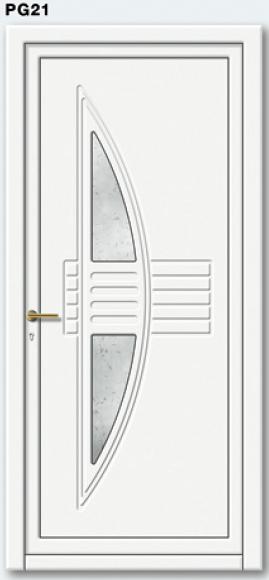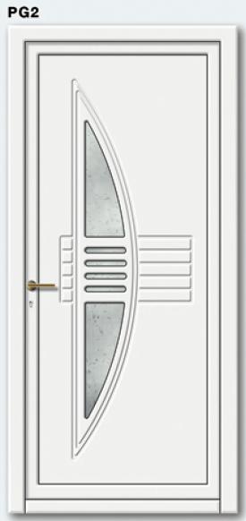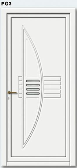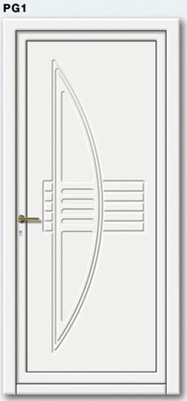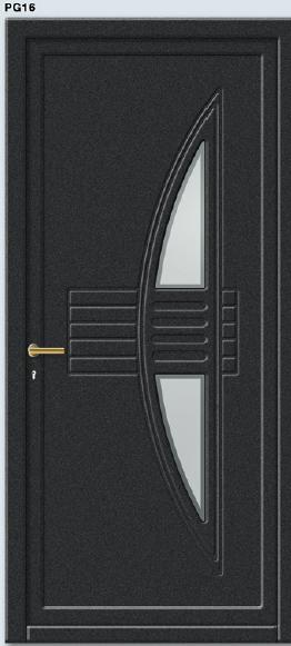 Painel de porta composto por 2 chapas de alumínio de 1,8mm de espessura com poliuretano injetado entre ambas, à densidade de 120kg/m3, com ou sem vidro.
