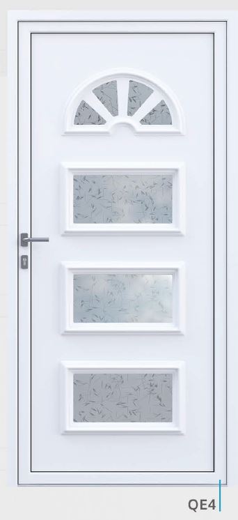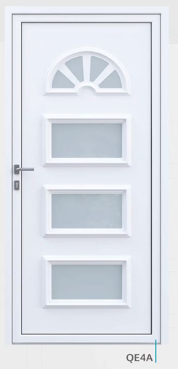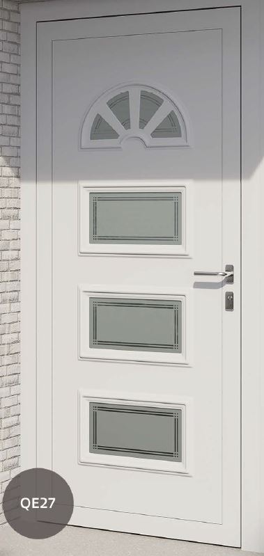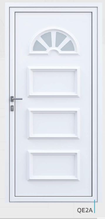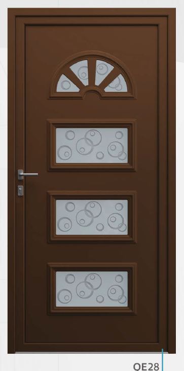 Painel de porta composto por 2 chapas de alumínio de 1,8mm de espessura com poliuretano injetado entre ambas, à densidade de 120kg/m3, com ou sem vidro.