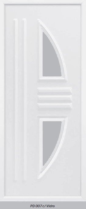 Painel de porta composto por 2 chapas de alumínio de 1,8mm de espessura, com enchimento por injecção de poliuretano de alta densidade.