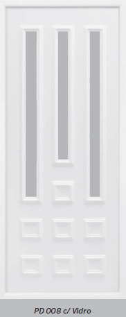 Painel de porta composto por 2 chapas de alumínio de 1,8mm de espessura, com enchimento por injecção de poliuretano de alta densidade.