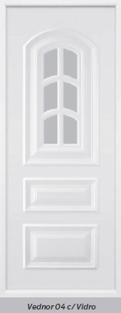Painel de porta composto por 2 chapas de alumínio de 1,8mm de espessura, com enchimento por injecção de poliuretano de alta densidade.