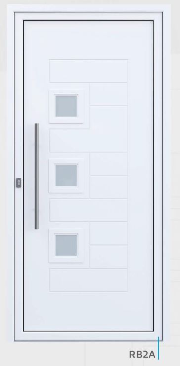 Painel de porta composto por 2 chapas de alumínio de 1,8mm de espessura com poliuretano injetado entre ambas, à densidade de 120kg/m3, com ou sem vidro.