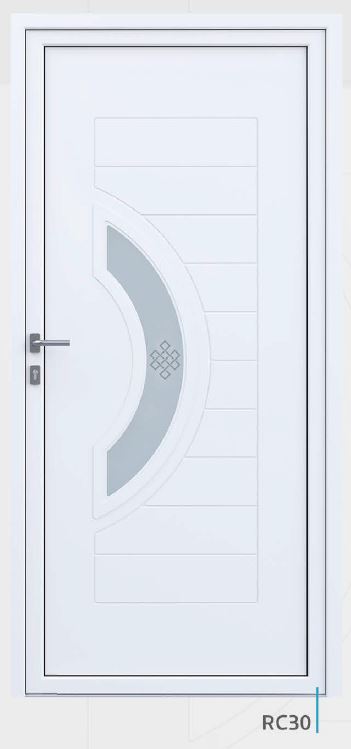 Painel de porta composto por 2 chapas de alumínio de 1,8mm de espessura com poliuretano injetado entre ambas, à densidade de 120kg/m3, com ou sem vidro.