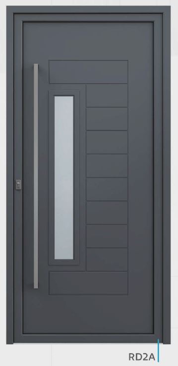 Painel de porta composto por 2 chapas de alumínio de 1,8mm de espessura com poliuretano injetado entre ambas, à densidade de 120kg/m3, com ou sem vidro.