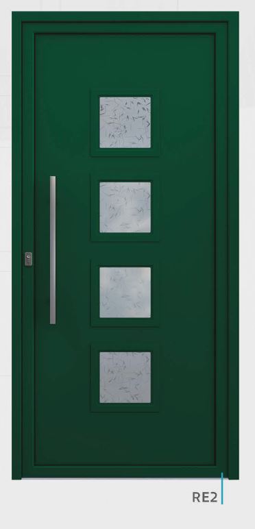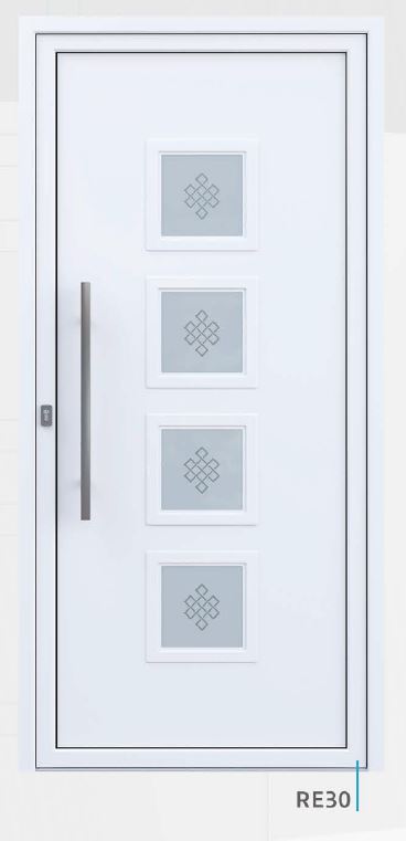 Painel de porta composto por 2 chapas de alumínio de 1,8mm de espessura com poliuretano injetado entre ambas, à densidade de 120kg/m3, com ou sem vidro.