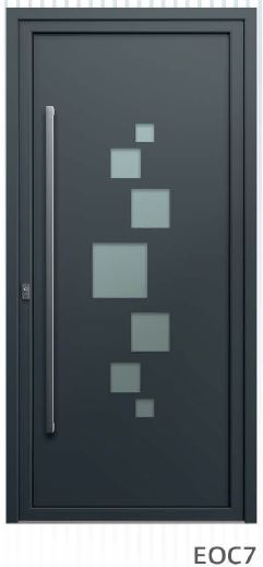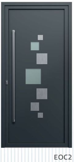 ​​​​​​Painel de porta composto por 2 chapas de alumínio de 2,5mm de espessura com poliuretano injetado entre ambas, à densidade de 120kg/m3, com ou sem vidro.