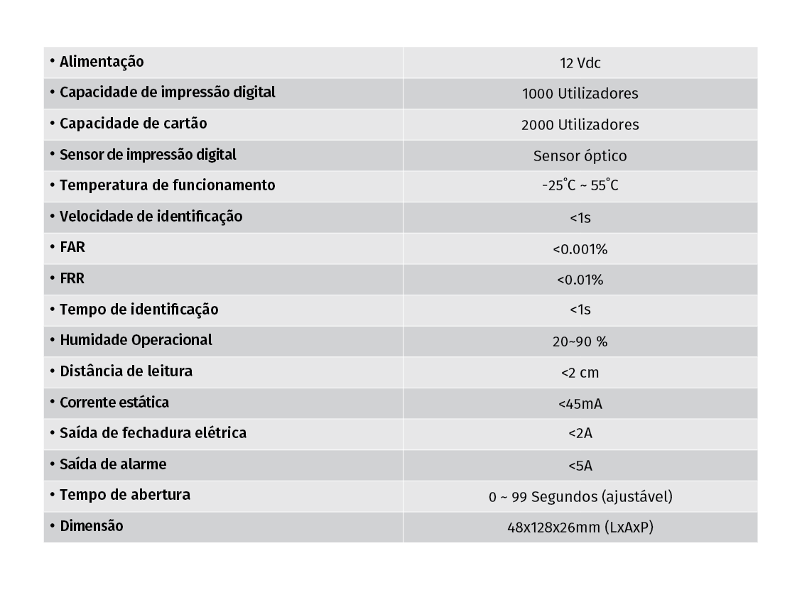 Características: . Leitura de cartões RFID e impressão digital . Funcionamento independente, sem auxílio de software externo . Antivandalismo . Permite fazer a gestão de acessos . Capacidade de memória até 1000 impressões digitais e 2000 cartões RFID